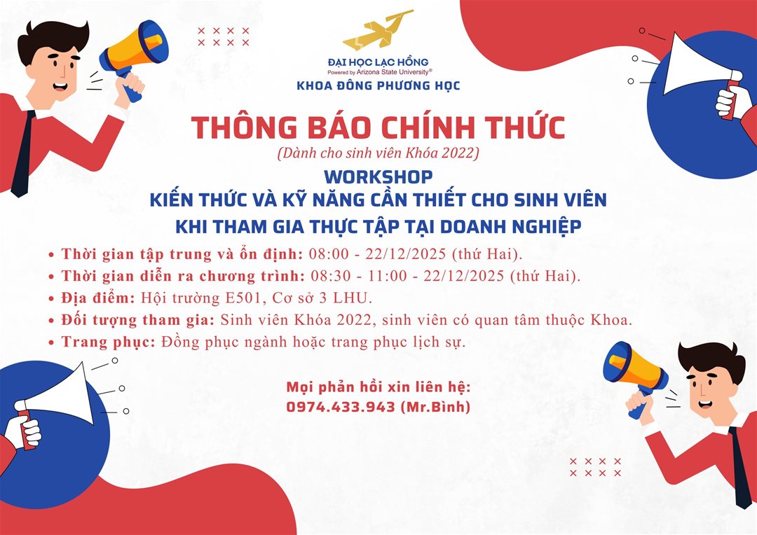 Nhằm chuẩn bị thật kĩ lưỡng cho sinh viên năm cuối (khóa 2022), Khoa Đông phương học trân trọng thông báo thông tin về Workshop "Kiến thức và kỹ năng cần thiết cho sinh viên khi tham gia thực tập tại doanh nghiệp".