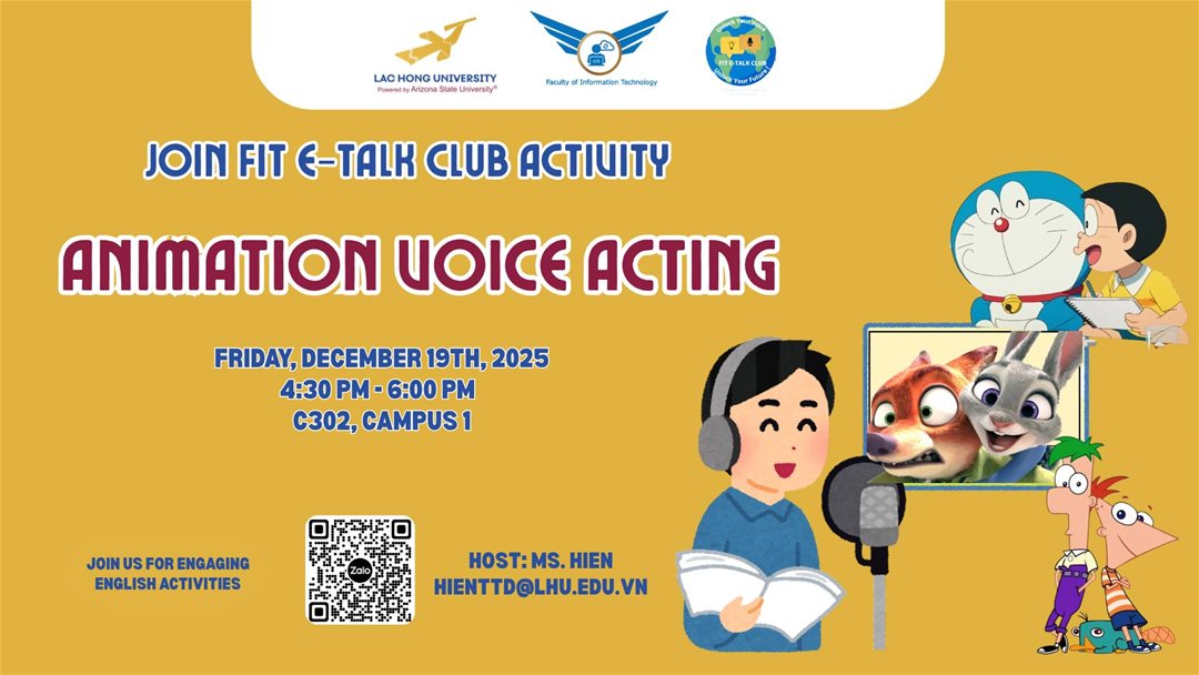 CLB tiếng Anh FIT E-Talk Club sẽ tổ chức một buổi sinh hoạt với hoạt động lồng tiếng phim hoạt hình bằng tiếng Anh.