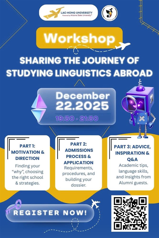 Hội thảo “Chia sẻ hành trình du học ngành ngôn ngữ” do Khoa Ngôn ngữ Anh – Trường Đại học Lạc Hồng tổ chức sẽ mang đến cho bạn những kinh nghiệm thực tế, chiến lược học tập hiệu quả và nguồn cảm hứng mạnh mẽ từ cựu du học sinh.