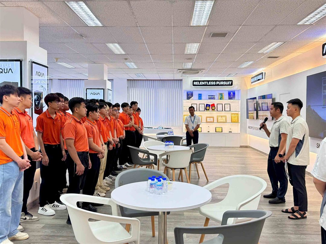 Tại buổi tham quan, sinh viên được đại diện công ty giới thiệu tổng quan về lịch sử hình thành và phát triển của thương hiệu AQUA, một trong những doanh nghiệp điện tử hàng đầu Việt Nam, thuộc tập đoàn Haier Group . Với hơn 25 năm hoạt động tại Việt Nam, AQUA đã không ngừng mở rộng quy mô sản xuất, khẳng định vị thế thương hiệu thông qua các sản phẩm gia dụng chất lượng cao như tủ lạnh, máy giặt, máy điều hòa và nhiều dòng sản phẩm điện tử tiên tiến khác, đáp ứng tiêu chuẩn quốc tế.