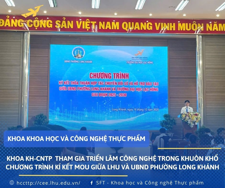 Sáng 16/12/2025, tại Hội trường UBND phường Long Khánh tỉnh Đồng Nai, Khoa Khoa học và Công nghệ thực phẩm đã tham gia triển lãm công nghệ trong khuôn khổ chương trình trường Đại học Lạc Hồng (LHU) ký kết Biên bản ghi nhớ hợp tác (MOU) với UBND phường Long Khánh.