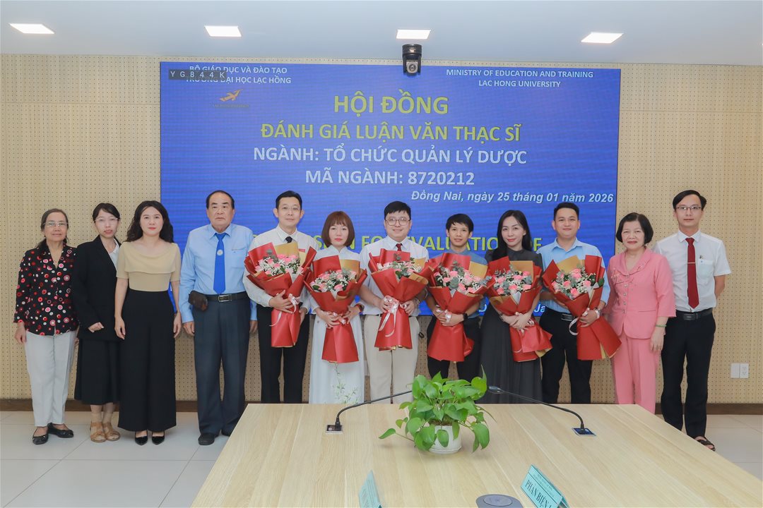 Ngày 25 tháng 01 năm 2026, tại phòng họp cơ sở 1 của Trường Đại học Lạc Hồng (LHU), 06 học viên thuộc ngành Tổ chức quản lý dược đã hoàn thành phần trình bày và bảo vệ luận văn thạc sĩ trước hội đồng chuyên môn. Buổi bảo vệ diễn ra trong không khí trang nghiêm, học thuật và chuyên nghiệp, đánh dấu cột mốc quan trọng trong quá trình đào tạo sau đại học tại nhà trường.