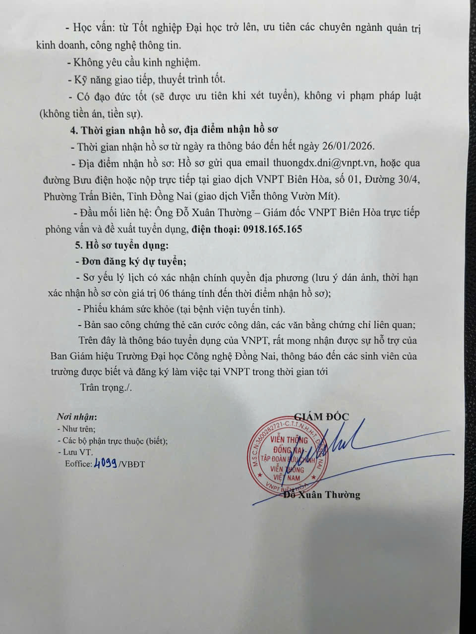 THÔNG BÁO TUYỂN DỤNG, VIỆC LÀM TOÀN THỜI GIAN LẦN 66, NĂM HỌC 2025-2026 (Viễn Thông Đồng Nai VNPT Biên Hòa).