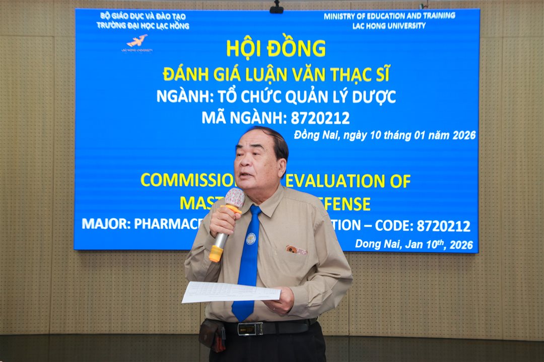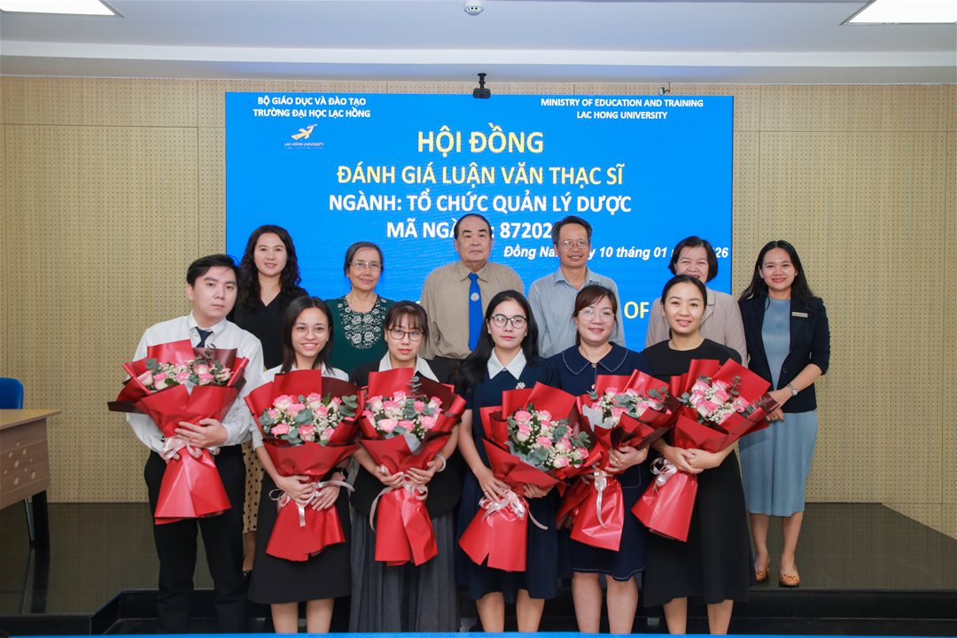 Ngày 10 tháng 01 năm 2026, tại phòng họp cơ sở 1 của Trường Đại học Lạc Hồng (LHU), 06 học viên thuộc ngành Tổ chức quản lý dược đã hoàn thành phần trình bày và bảo vệ luận văn thạc sĩ trước hội đồng chuyên môn. Buổi bảo vệ diễn ra trong không khí trang nghiêm, học thuật và chuyên nghiệp, đánh dấu cột mốc quan trọng trong quá trình đào tạo sau đại học tại nhà trường.