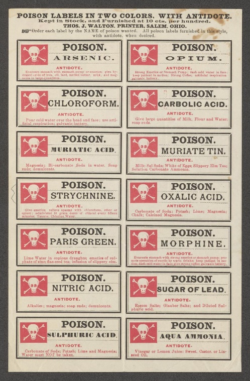 Nhãn giữa thế kỉ 19, thời đó nhãn chưa được dán keo, nhãn được in vào từng cuốn sách. Khi cần dược sĩ sẽ tự cắt, điền thông tin và bọc cố định quanh cổ chai bằng dây