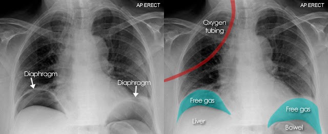 Figure 2. Perforated hollow viscus on upright chest radiograph: subdiaphragmatic free air crescent